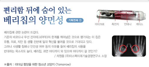결국 머지 않아 세계는 정보화의 발달로 완전한 신용화폐의 시대로 접어들게 될 텐데, 이 상황에서 이 칩이 없다면 결국 요한 계시록에 예언된 대로 '매매를 하지 못하는' 상황이 발생하게 되어 사회에서 생존 자체가 불가능한 상황에 이르게 됩니다. 많은 사람들은 편리함이 주는 유익 때문에 칩을 받겠지만, 결국은 이 칩이 '빅 브라더'에 의한 통제 수단으로 이용되어 사람들은 기계적인 객체로 전락할 상황으로 치닫게 됩니다. 따라서, 절대로 베리칩을 받아서는 안될 것입니다.