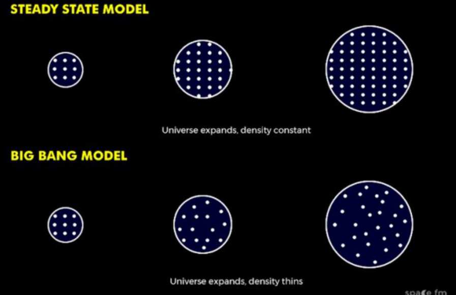 우주의 시간을 거꾸로 돌리면 원시 우주에는 모든 물질(현재 우주의 모든 것)이 한 점에 모이는 초고온 초밀도의 특이점이 생기는데, 이를 물리학으로는 도저히 설명할 수 없으므로 납득하기 어려웠던 것입니다. 그래서 이들은 1948년 '정상우주론'(steady state cosmology)을 발표하였습니다.