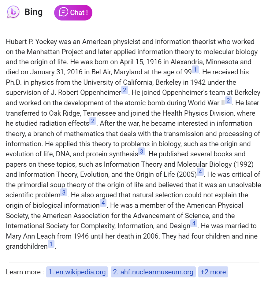 "의심할 나위 없이 에너지는 간단한 질서 패턴을 생성할 수 있습니다. 예를 들어, 해변가 모래사장에 잔물결이 이는 것은 파도 때문입니다.그러나 모래 위에 '존을 메리를 사랑한다' 고 쓰여 있고 하트 모양에 화살이 꽂혀있는 그림이 있다면, 그것이 에너지만으로 생겨난 것일까요? 유명한 정보 이론가 H.P.요키 (Yockey)는 '질서의 개념을 생물학적 조직과 연결시키려는 시도는, 정밀 검사를 통과할 수 없는 말장난' 이라고 했습니다."